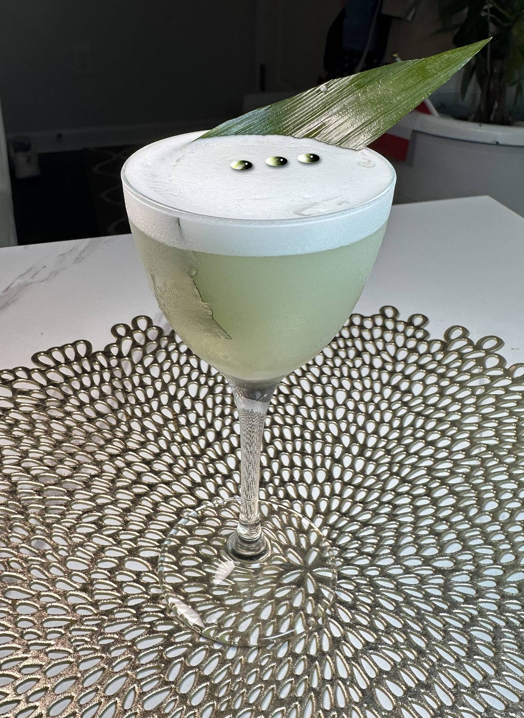 Discover our spirit infused coconut fat washed mezcal mix with lychee liqueur, lime juice, pandan syrup, aquafaba. Add on scents of pandan essential oil